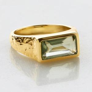 The Annabelle Ring showcases a captivating baguette-shaped green amethyst stone, exuding elegance and sophistication. This stunning centrepiece is beautifully set on a sleek band, creating a harmonious blend of modern design and timeless appeal. Perfect for adding a touch of refined colour and sparkle to any outfit, the Annabelle Ring is a striking addition to your jewellery collection. Made Nickel Free Hypoallergenic brass metal 2 Micron 18k Gold Plated Natural Green Amethyst stone This piece is not recommended to be worn in water