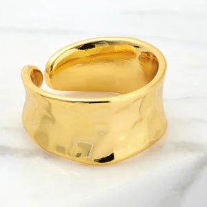 This ring is a versatile and charming addition to your jewellery collection, exuding a subtle elegance and flair. The softly hammered texture adds a touch of uniqueness and sophistication, making the Bianca Ring a perfect statement piece for any occasion. Whether worn alone as a standalone statement or paired with other rings for a trendy stacked look, the Bianca Ring will effortlessly elevate your everyday style. Made Nickel Free Hypoallergenic brass metal 18K Gold Plated / Silver Rhodium Plated Size: 7 to 8 (US Standard Size)
