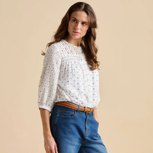 Textured, breezy, and fresh, this stunning blouse is a spring dream. The care-free structure compliments the sheer fabric while the pleats and cuffed sleeves add shape. Pair with denim shorts and sandals.