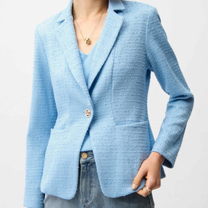 Tailored sophistication with rich texture, this bouclé blazer features a sharp notched collar, princess seams at the back, front pockets, and a bold statement button for a refined finish.
