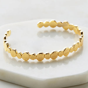 The Chloe Bracelet is a stunning cuff that combines bold elegance with intricate detail. Featuring a hammered disk design, this bracelet catches the light beautifully, showcasing its textured finish. Perfect for both day and night looks, the Chloe Bracelet makes a sophisticated statement, whether worn solo or paired with the Chloe Necklace, Ring and Earrings to complete the collection. Its timeless design and luxurious feel make it a must-have addition to any jewellery collection. Made Nickel Free Hypoallergenic brass metal 18k Gold Plated 6cm Internal Radius Water resistant