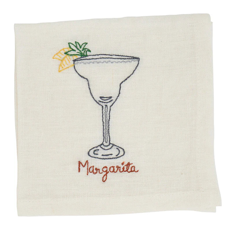 This cocktail napkin will make a stylish addition to your next party. Each cocktail napkin features a hand embroidered illustration of a cocktail and glass. Made from a soft linen cotton blend.