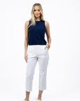 The Colette Tank is knitted from all natural fibres making it perfect for year-round comfort. The beautiful 100% cotton yarn is breathable and cool all summer long. A great basic that can be dressed up or down. We have teamed it with our easy wearing Fleetwood Linen Pant and a pair of Humidity Slides.