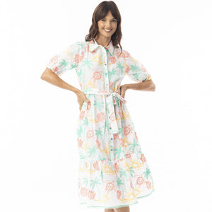 Whisk yourself away with the horizon-chasing Coral Collar Elbow Sleeve Dress. This dress features a unique embroidery feature design of sunny palms, sea turtles, and coral. It includes graceful gathered half sleeves, a flattering fabric tie belt, and a playful frill hem, perfect for an ocean-inspired escape.