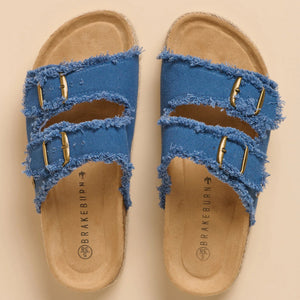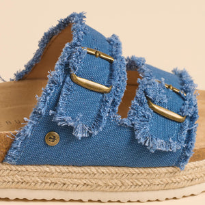 Find the perfect fusion of fashion and comfort in these retro-styled chunky platform sandals with frayed denim straps and rope trim. With wide adjustable straps and naturally supportive moulded cork footbed with soft faux-suede finish, these sturdy sandals will carry you through all your summer adventures with ease.