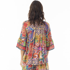 Wrap yourself in the beauty of the light-as-air Francesca Top. Featuring an open neckline with tassel details, three-quarter flared sleeves, vibrant colours of an ornate kaleidoscope and a relaxed silhouette, this is the perfect top to throw on with a pair of our rayon pants at the beach.