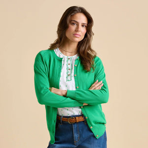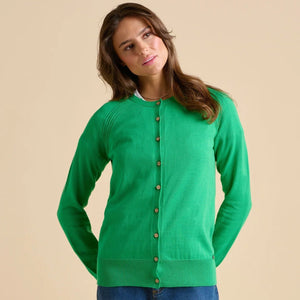 This vibrant green cardigan brings a burst of colour with its lightweight, breathable knit - perfect for layering. The fitted waist creates a flattering silhouette while the wooden buttons hint at a nature feel. Pair with a white tiered skirt and green hair accessories.