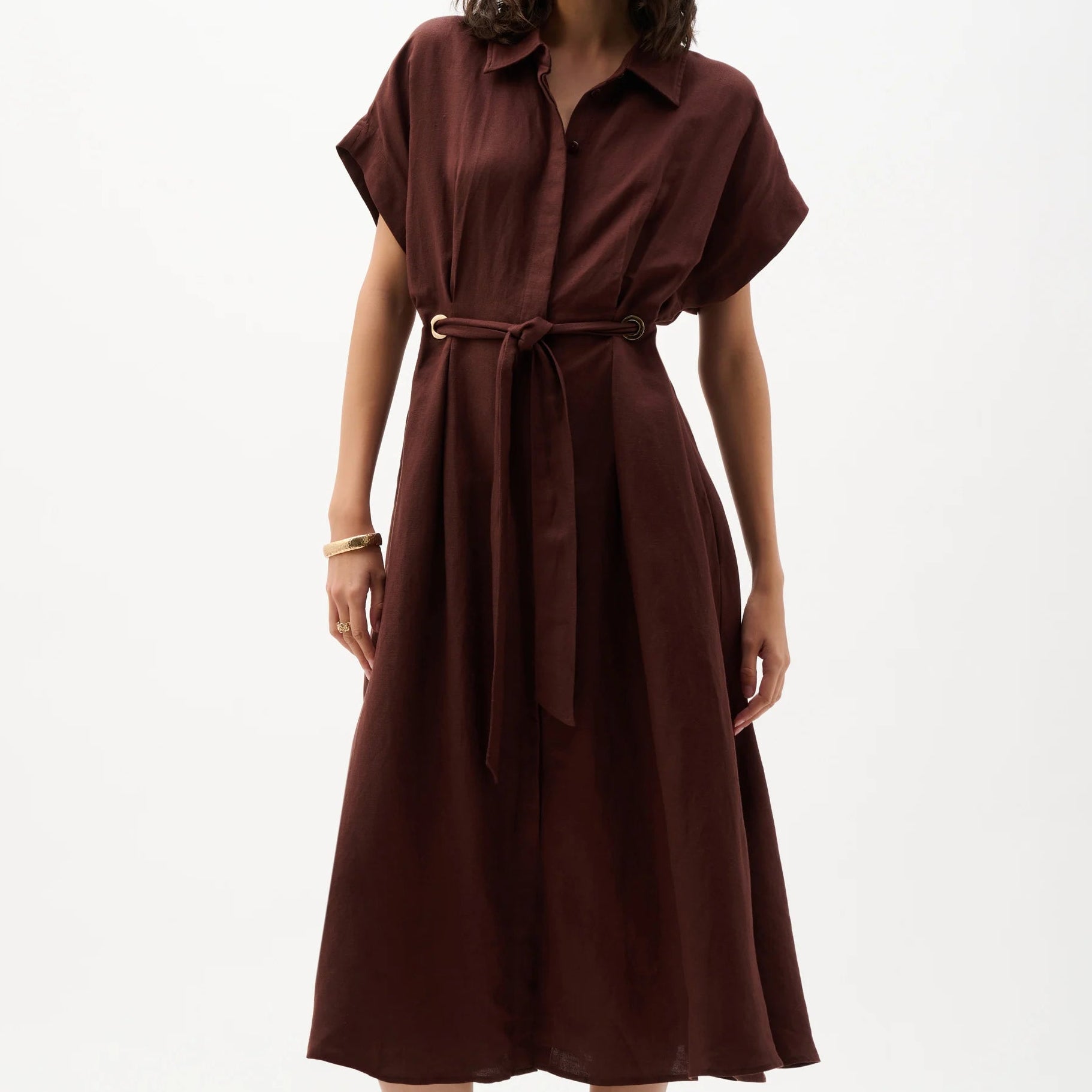 Crafted from a breathable linen blend, this midi dress combines relaxed ease with tailored detail. A shirt collar and hidden placket refine the fit and flare shape, while eyelet accents and a sash belt define the waist with subtle charm.