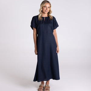 This elegant linen midi dress features graceful puff sleeves and a delicate keyhole front, combining classic charm with modern sophistication. Its flattering midi length offers a refined silhouette perfect for both daytime events and evening occasions. Crafted for comfort and style, this dress is an effortless choice for a polished, timeless look.