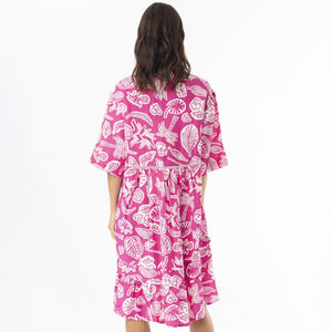Wrap yourself in the beauty of the timeless Linen Print Pink 3/4 Sleeve Layer Dress. This enchanting dress features a delicate cut-out palms design infused with the classic allure of linen. It boasts a versatile knee-length hem, a refined classic collar, beautifully layered tiers for graceful movement, and elegant 3/4 sleeves for a touch of sophistication.