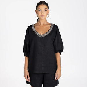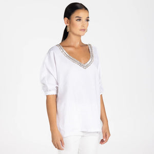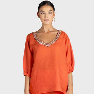 This Linen V-Neck Beaded Top offers a relaxed fit for effortless comfort. The delicate beaded detail adds a subtle touch of elegance, while the v-neckline enhances sophistication. Elastic sleeves finish at the elbow, providing a tailored yet easy going silhouette perfect for refined casual wear.