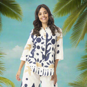 Add some fun to your everyday style with our Nazca Collar Top. Featuring relaxed three-quarter sleeves and a classic collar, this shirt boasts vibrant prints that make a bold statement. Perfect for casual days or dressing up, its comfortable fit and eye-catching design ensure you stand out in style.