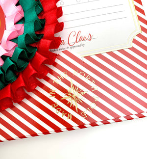 A festive three-tier satin ribbon rosette, finished with shiny gold foil text that reads “Approved by Santa Claus – Nice List Member.” Each rosette includes a pin badge back and is presented in a printed box marked “Made in the North Pole.”