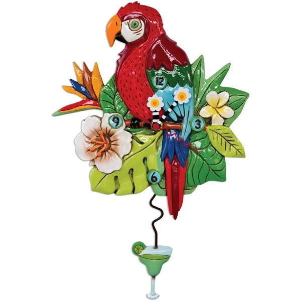f you cannot get to the tropics it is time to bring the tropics to you with this pretty Polly Parrot clock by Allen Designs to hang on your wall. It gives your home a touch of fun art and artistic character with its full-on tropical charm everywhere you look even the swinging margarita pendulum. This parrot clock is made of durable resin and hand painted in shades of red green blue and yellow and finished with a protective glossy polyurethane coating. It requires just 1 AA battery not included. This 13.75 inch high 9 inch long 1.75 inch wide turtle clock is the perfect home decor accent for those with an eye for the unusual and a modern sense of style