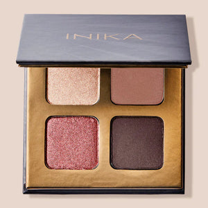 - Starting on a primed and prepped complexion, apply Eyeshadow Quad in Wind to eyelids and blend using your INIKA Organic Shadow Brush or fingertips.