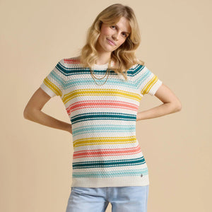 This knitted tee is playful with vibrant rainbow stripes that flow seamlessly into the sleeves. Its quirky design adds a fun, cheerful touch to your wardrobe, making it perfect for casual outings or when you want to brighten up any day with a splash of colour.