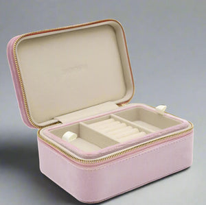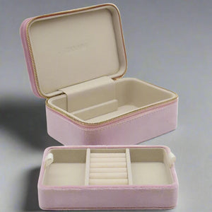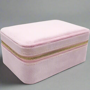 Our velvet Rectangle Jewellery Case Blue is the sweetest thing. Crafted from the softest pale velvet with a gold zip around closure, this case is a compact item that can easily slip into your luggage or handbag. Inside there is space for rings, earrings, and dainty necklaces. A lift out tray reveals a space underneath for larger bangles and necklaces.