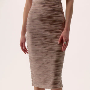 Crafted from luxurious cascade knit, this form-hugging pencil skirt exudes refined elegance. Designed for both style and comfort, its pull-on waistband ensures effortless wear, while a back slit allows for graceful movement.