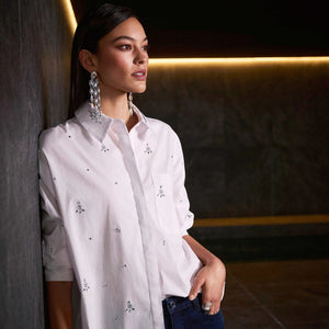 This blouse features a classic shirt collar, hidden button-front closure, and a relaxed fit for all-day comfort. Crafted from stretch cotton, it’s accented with sparkling rhinestones at the collar for a touch of refined elegance.