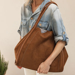 The Sutton Tan Shoulder Bag is a modern take on the classic slouchy silhouette, blending relaxed ease with refined detailing. Designed in soft yet structured faux suede, she’s elevated with contrast top-stitch accents for a subtle point of difference. Sutton’s spacious interior offers ample room for your daily essentials, with capacity to fit up to a 16-inch laptop, while a secure magnetic clasp keeps everything in place. Equally suited to busy workdays or leisurely weekends, she moves effortlessly from on-the-go moments to off-duty style. Understated, versatile, and endlessly wearable, Sutton is the bag you’ll reach for season after season.