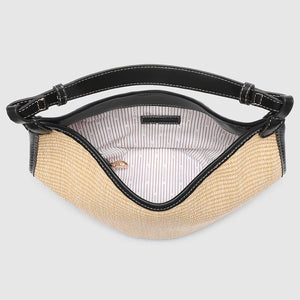 The Taya Raffia Black Mini Tote Bag is a fresh take on summer styling - petite in size, bold in texture, and made for days under the sun. Crafted from natural raffia and contrasted with buttery soft vegan leather, this top handle bag features a sleek boat-shaped silhouette that brings structure to a relaxed coastal mood. Designed as a versatile convertible tote, Taya Raffia Black offers multiple ways to wear her: a short vegan leather top handle for a polished look, or an adjustable, detachable crossbody strap for hands-free ease. The balance of the woven body and smooth trim captures the essence of sunlit escapes and beachside strolls, while her compact size makes her the perfect companion for café catch-ups, market mornings, and spritz-soaked afternoons.