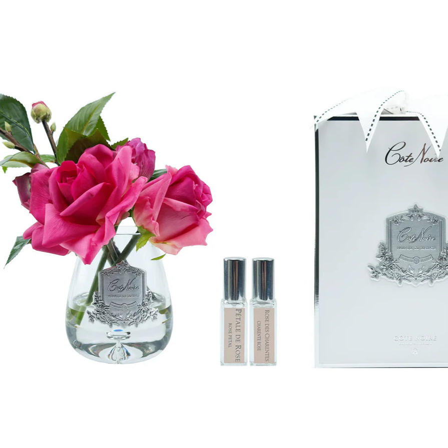 Dramatic roses paired with matching buds in a beautiful hand made teardrop vase with silver badge, complemented by Charente Rose and Rose Petal perfume.