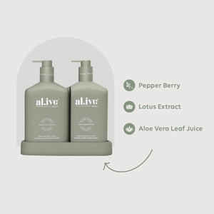 The al.ive body Green Pepper & Lotus Hand & Body Wash/Lotion Duo contains a luxurious blend of naturally derived ingredients, fortified with essential oils and native botanical extracts.